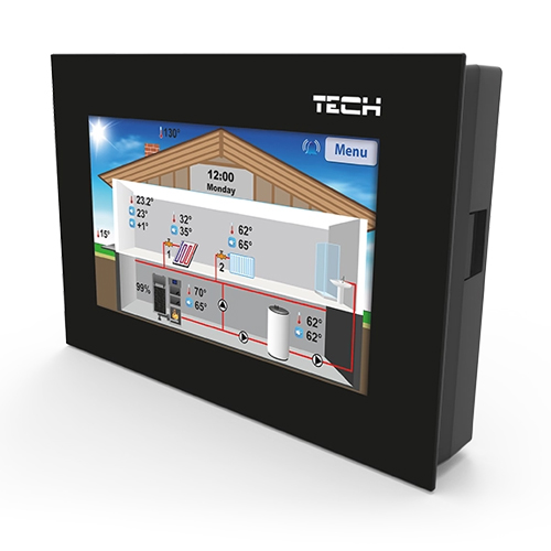 Контролер TECH EU-281 - це кімнатний регулятор з RS зв'язком, призначений для дублюючого керування температури приміщення, котла, бойлера, змішуючих клапанів, безпосередньо з того місця де встановлений регулятор, без необхідності йти в котельню. Він оснащений кольоровим LCD дисплеєм з багатим та простим меню. З'єднується з основним контроллером через RS зв'язок (провідником).