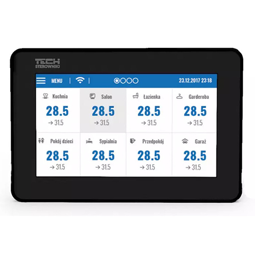 Панель керування Tech M-9T відповідає за керування роботою кімнатних регуляторів. Він надсилає інформацію про поточну температуру на планку, яка на цій основі керує термостатичними клапанами.