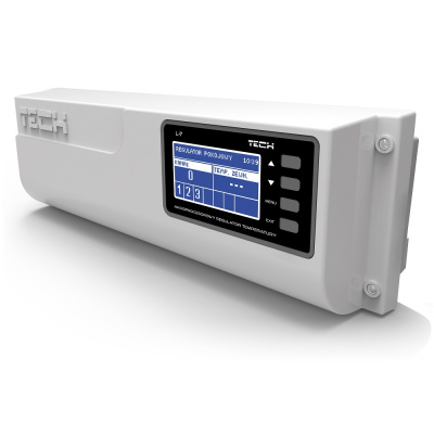 Tech L-7 - це блок керування, який керує термостатичними клапанами, що в свою чергу відкривають або закривають потік теплоносія в контури теплої підлоги. Контролер працює у такому порядку: отримавши запит на нагрів кімнати від кімнатного термостата, відкриває потік теплоносія в контури даної кімнати. При досягненні заданої температури все проходить в зворотньому порядку. З'єднується з кімнатними регуляторами провідним зв'язком. Терморегулятори можуть бути одно або двох позиційними, з функцією програмування або без неї. Контролер може обслуговувати до 8-ми зон. Має LCD дисплей з можливістю зміни налаштувань кожної зони. Керує одним циркуляційним насосом та має безпотенціальний вихід для керування додатковим нагрівальним пристроєм. Важливою функцією є можливість підключення інтернет модуля, що дає можливість керування з мобільного пристрою.
