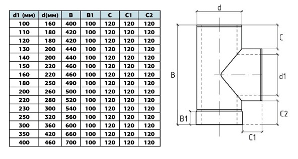 Трійник призначений для відводу газів, що видходять в димохід і забезпечує можливість чищення та обслуговування димохідної труби, внутрішня частина виготовлена із нержавіючої сталі марки AISI 304, товщиною 1,0мм, зовнішня - AISI 201, товщиною 0,55мм.