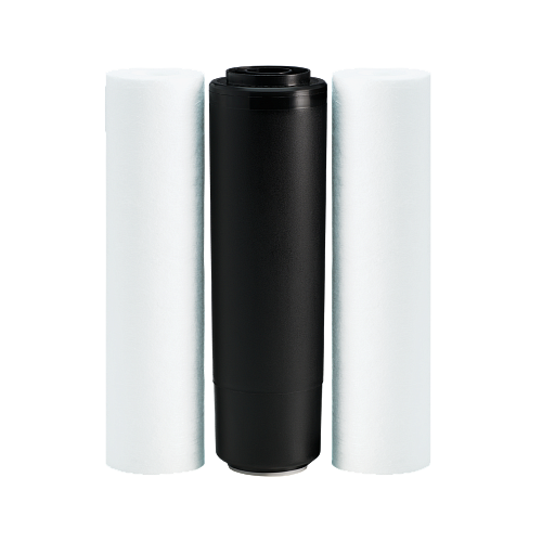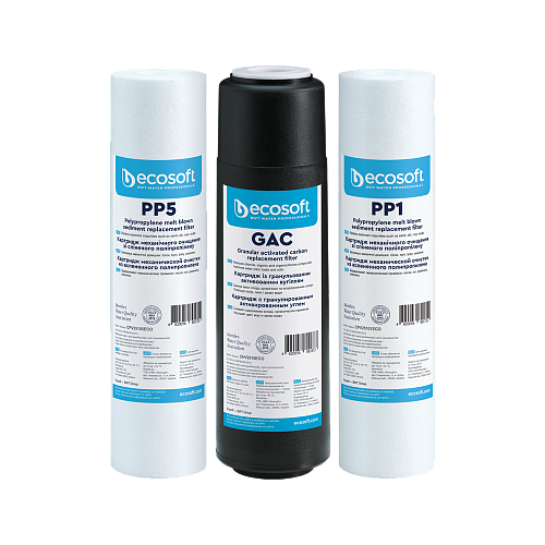 В комплект входять три картриджі Ecosoft, які необхідні для попереднього очищення води перед мембранним елементом у фільтрі зворотного осмосу.