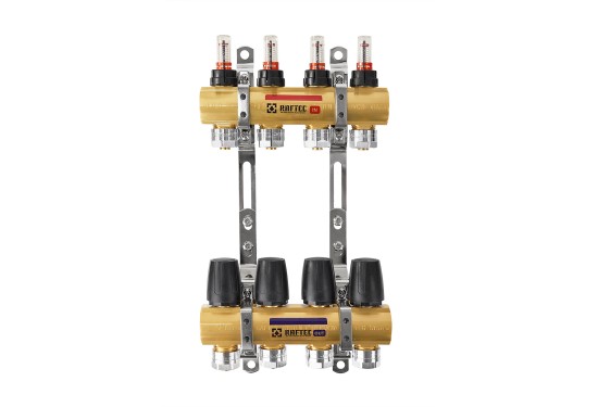 У комплект системи входять колектори з витратомірами, які можуть регулювати проток теплоносія, а можливість установки сервоприводів з контролером дозволять автоматизувати систему. У комплекті з колекторами йдуть настінні кріплення і термометри. У разі якщо в системі опалення теплоносій вище 55 ° С, необхідно встановлювати на колектор змішувальні групи з перепускним клапаном і термостатичними кранами.