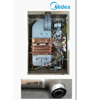 Принцип роботи турбованої газової колонки Midea JSG22 полягає в миттєвому нагріванні води в мідному теплообміннику при згорянні газу всередині самого газового приладу.