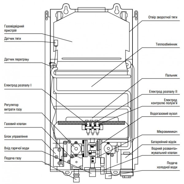 - Комплексною системою безпеки в складі датчика тяги, захисного термостата, електромагнітного газового клапана, запобіжного клапана і мікрови