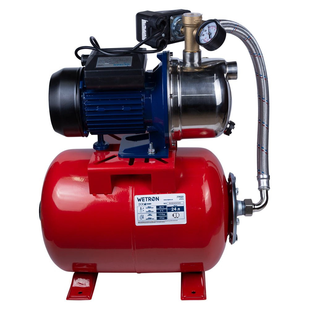 Станція 1.1кВт Hmax 48м Qmax 60л / хв (самовсмоктуючий насос нерж) 24л Україна Wetron (775054/24) обладнана гідроакумулятором об'ємом 24 літра і керуючої автоматикою. Станція призначена для перекачування чистої води і може застосовуватися: для побутового водопостачання, допоміжного обладнання, підйому води в трубопроводах високого і низького тиску, для зрошувальних систем садів і городів, теплиць і парників. Установка устаткування повинна проводитися в місцях, захищених від атмосферного впливу і вологи. Гарантія 12 місяців.