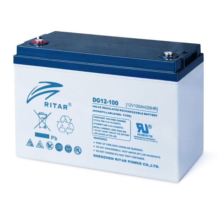 RITAR AGM DC 12-100 (12V 100Ah) - гелевий акумулятор, що використовується для забезпечення тимчасового живлення елементів які споживають напругу 12 В, при відсутності живлення від мережі. Акумуляторні батареї практично не вимагають ніякого обслуговування і характеризується низьким рівнем саморозряду. Електроліт пристрою має гелевидний стан, що не боїться нахилу і перевороту. Акумулятори даного типу можуть працювати при температурах від -20 до +60 °C, але все ж для тривалого терміну експлуатації акумулятори треба розміщувати в теплому приміщенні. Корпус акумулятора виконаний з міцного негорючого пластика.