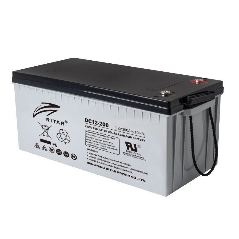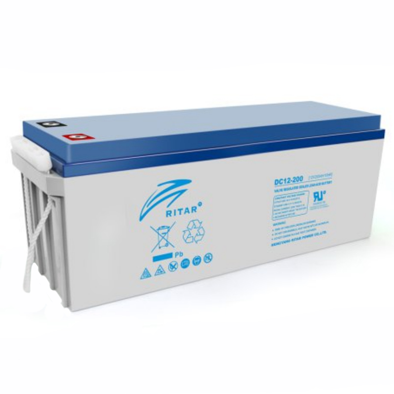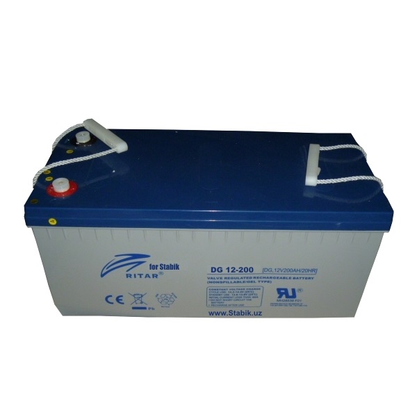 RITAR AGM DC 12-200 (12V 200Ah) - гелевий акумулятор, що використовується для забезпечення тимчасового живлення елементів які споживають напругу 12 В, при відсутності живлення від мережі. Акумуляторні батареї практично не вимагають ніякого обслуговування і характеризується низьким рівнем саморозряду. Електроліт пристрою має гелевидний стан, що не боїться нахилу і перевороту. Акумулятори даного типу можуть працювати при температурах від -20 до +60 °C, але все ж для тривалого терміну експлуатації акумулятори треба розміщувати в теплому приміщенні. Корпус акумулятора виконаний з міцного негорючого пластика.