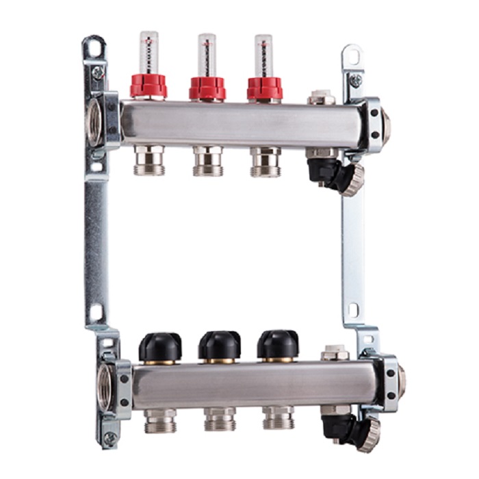 Розподільчий колектор подаючого та зворотного контуру з нержавіючої сталі, попередньо зібраний. Основне з'єднання G 1 F. Колектор прямої лiнiї в комплекті з регуляторами витрати і витратомірами, діапазон 0-5 л/хв. Колектор зворотного контуру з можливістю підключення електротермічних головок. Виходи G 3/4 М євроконус. Монтажні кронштейни.