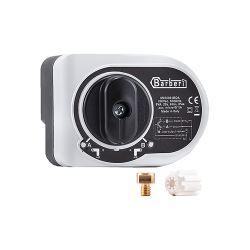 Привід M03 - це пристрій, що використовується для роботи обертових змішувальних клапанів. Він може застосовуватися для всіх змішувальних клапанів Barberi®, 3 або 4-х напрямних, крім фланцевих змішувальних клапанів. Доступний з 3 або 2-кратним (вмиканням / вимкненням) управлінням, з кутом повороту на 90 ° Привід можна використовувати вручну, натискаючи на ручку, тим самим відмикаючи передачу. Артикул поставляється з вбудованим кабелем, противоротним штифтом і перехідником змішувального клапана. Якщо необхідний зворотний зв'язок або інша активація пристрою, доступні версії з допоміжним мікроперемикачем.