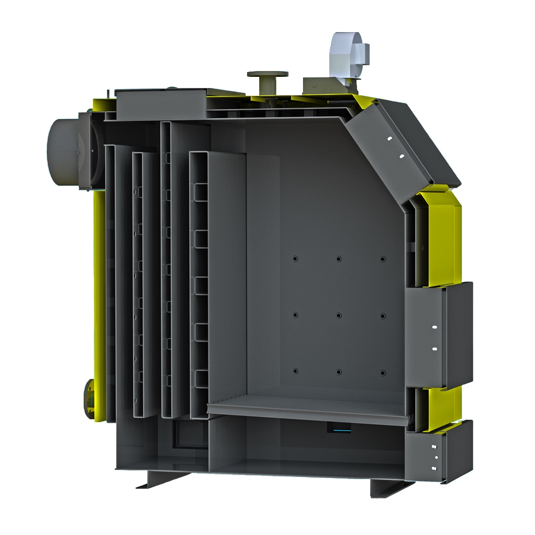 KRONAS PROM 200 kW - Промисловий твердопаливний котел призначений для опалення об'єктів з великою площею - адміністративних будівель, виробничих приміщень, теплиць і об'єктів комунального господарства. Котел має велику паливну топку та багатоходовий теплообмінник з вертикальними каналами, що гарантує зручність обслуговування котла і дає можливість використовувати паливо великого діаметру і довжини. Система вертикальних полиць сприяє меншому засміченню теплообмінника, що значно підвищує ефективність роботи котла, завдяки чому ККД становить 83%. Котел виготовлено з високоякісної котлової сталі, товщиною 4-6 см. Всі твердопаливні котли серії KRONAS PROM комплектуються сучасним контролером польського виробника і мають широкий ряд можливостей, аж до дистанційного керування.