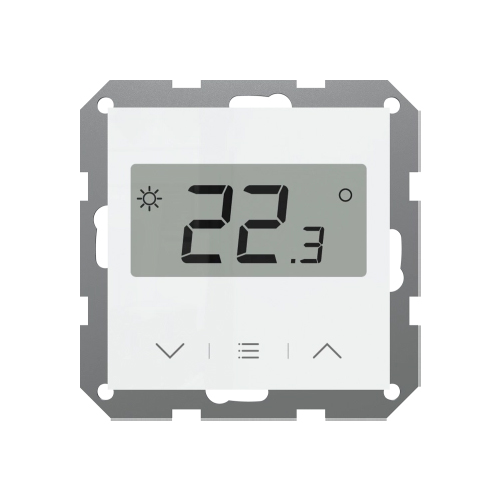Комнатный регулятор F-8z предназначен для использования с планками управления. Устанавливается в отдельных отопительных зонах. Он передает информацию о текущей температуре и влажности на главный контроллер, управляющий на этой основе термостатическими клапанами (открывая их, когда помещение недогрето, и закрывая при достижении заданной температуры в помещении). Текущая температура непрерывно отображается на дисплее. С помощью центральной кнопки меню можно изменить отображение температуры на текущую влажность.